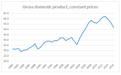 V obou případech byl během Caracaza i nyní deficit všech běžných účtů středem všech problémů (viz obrázek výše). Ačkoliv lze levici centrálních vlád Cháveze a Madura obviňovat z toho, že nedokázali prolomit strukturální závislost na ropě, je nepravděpodobné, že by se jednalo o problém právě levice středních vlád. Ve skutečnosti, i přes tento hrozný kolaps ekonomiky, za celé období počínaje rokem 1999 (nebo 2003, poté, co Chávezova vláda přežila puč sponzorovaný USA a převzala ropnou společnost), ekonomika značně vzrostla (viz obrázek níže).